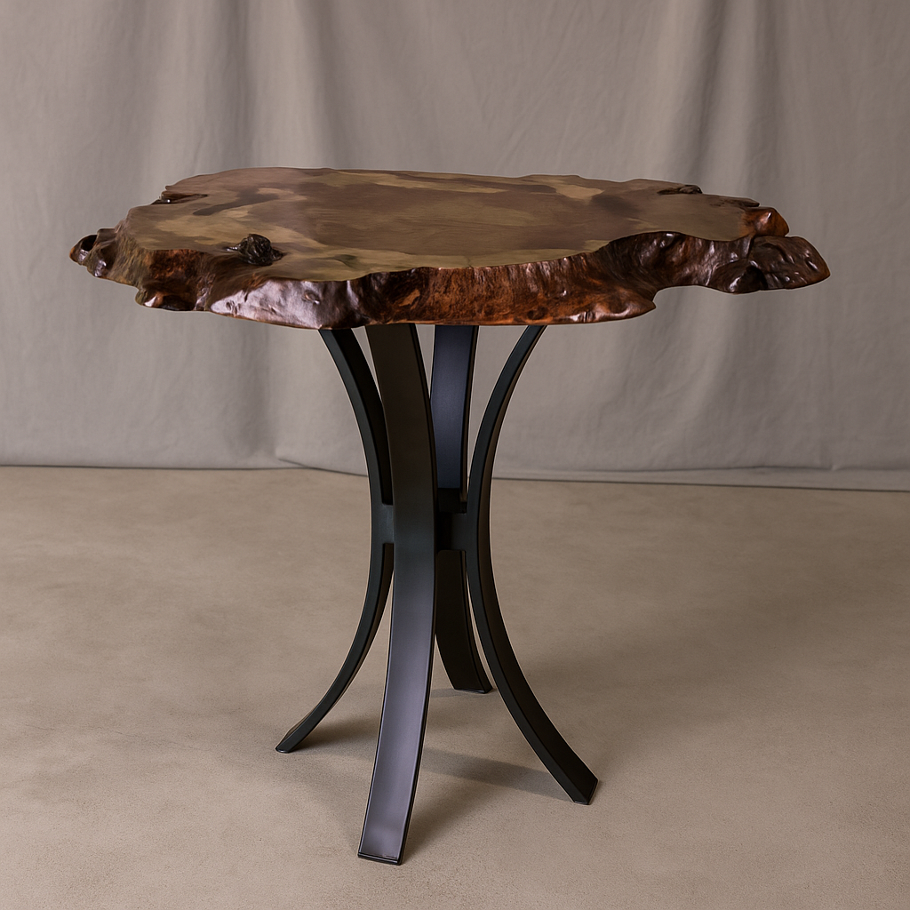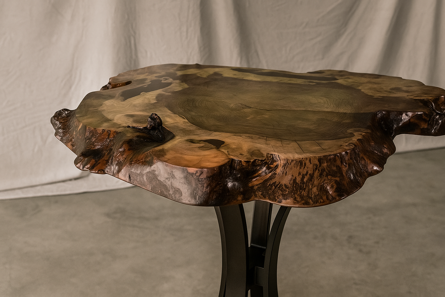 Crafted from rare walnut burl found deep underground, this bar table is a true statement piece. The rich, organic patterns of the burl are elevated by a smooth satin finish, highlighting its natural beauty. Bold, elegant, and one of a kind, the Bistro Bar Table brings grounded luxury to any gathering space.